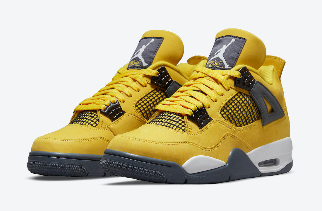 Dressed in a Tour Yellow, White, and Dark Blue Grey color scheme. This Air Jordan 4 looks very similar to the original, featuring a Tour Yellow nubuck upper paired with Grey detailing, Black hits on the netting atop a White midsole.