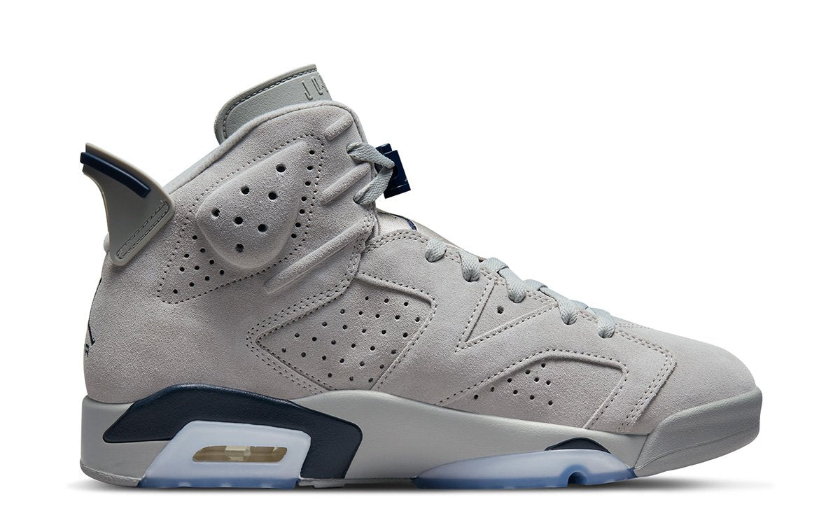 Dressed in a Magnet and College Navy color scheme. This offering of the Air Jordan features a Grey suede base with matching tongues, laces, heel clips, and midsole. 3M reflective perforations, Navy accents at the midsole, heel clip, and Jumpman branding atop an icy translucent outsole completes the design.