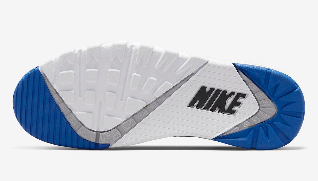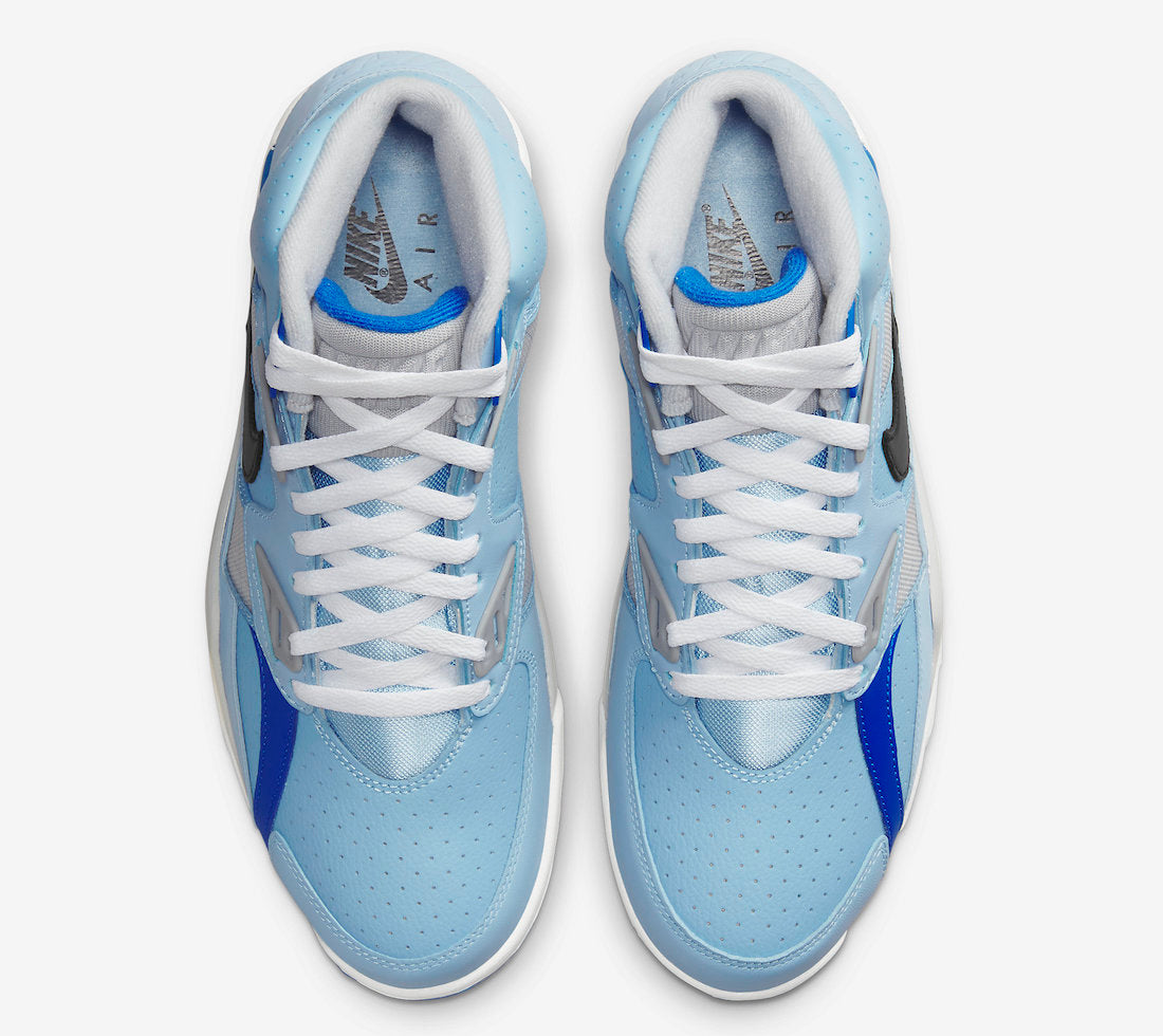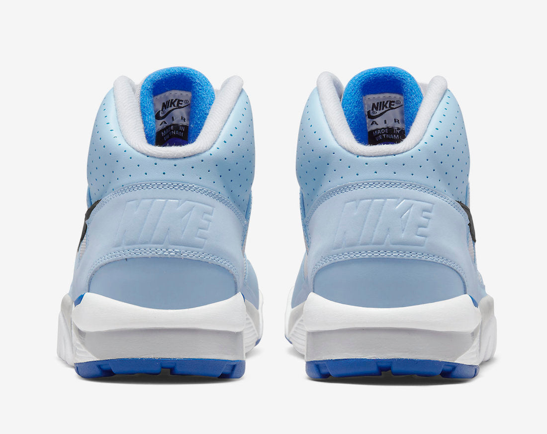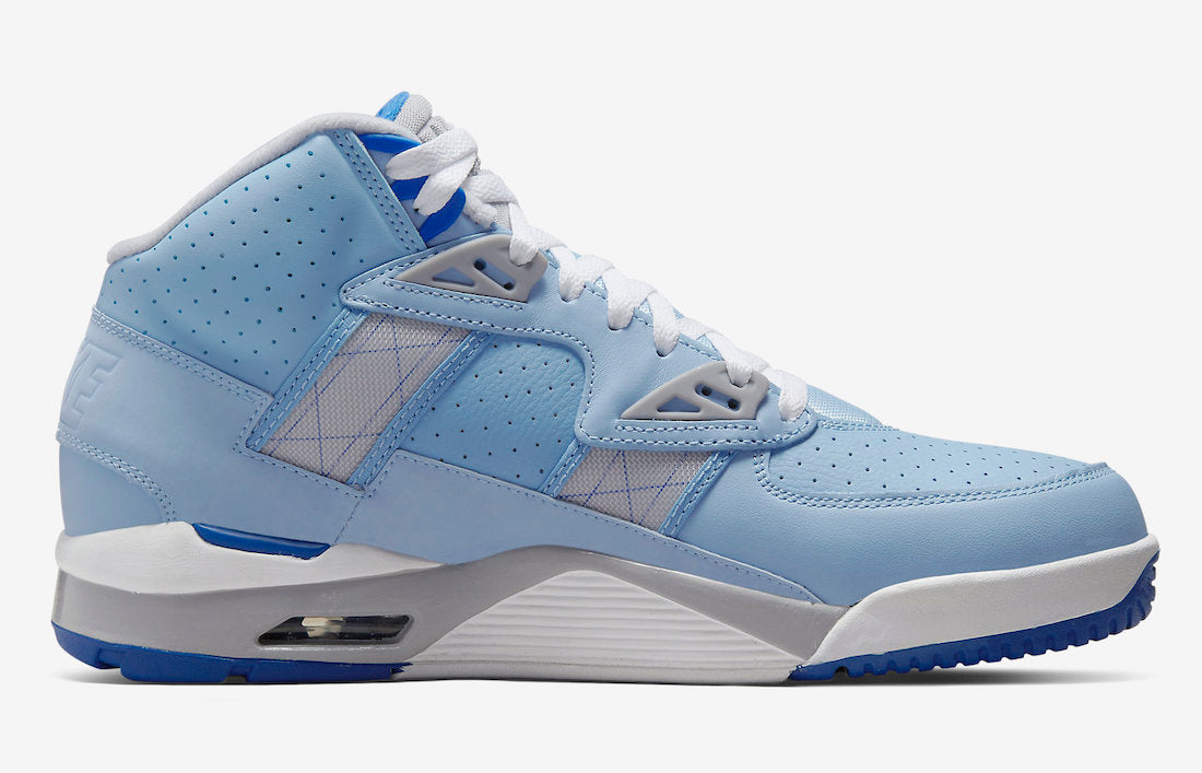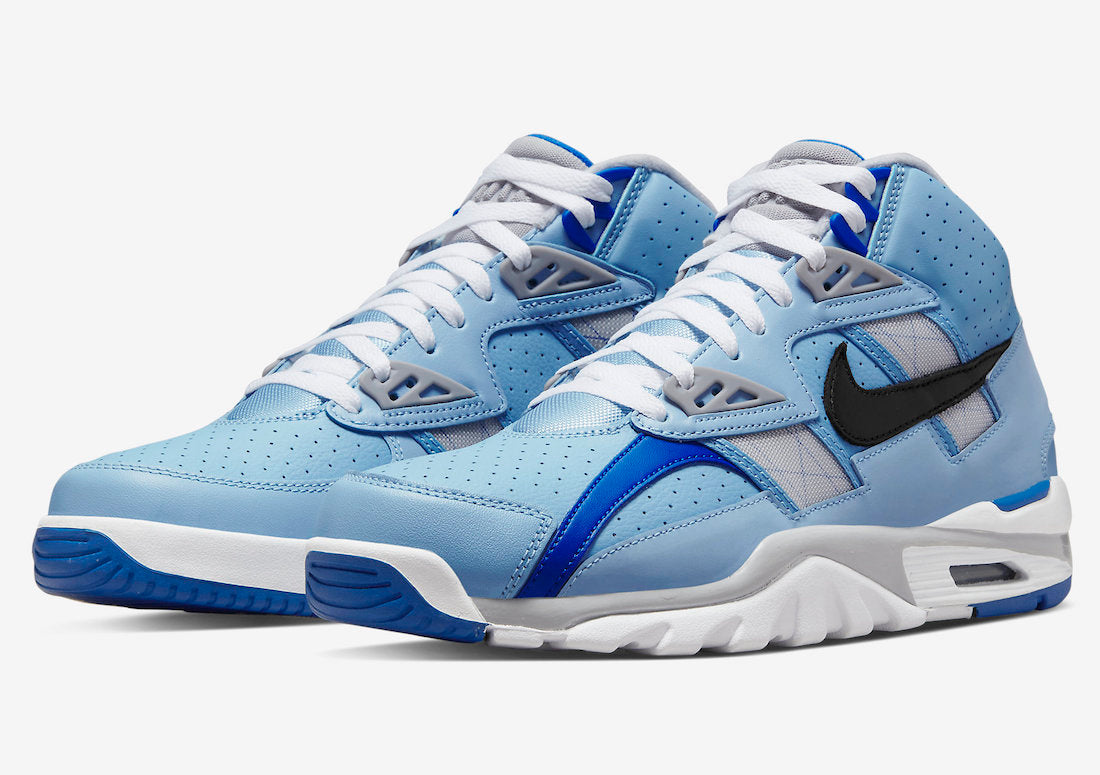 This offering of the Air Trainer SC High features a Light Blue perforated leather upper paired with darker Blue and Grey detailing. Black Swooshes on the sides with White laces and midsole atop a rubber outsole completes the design.