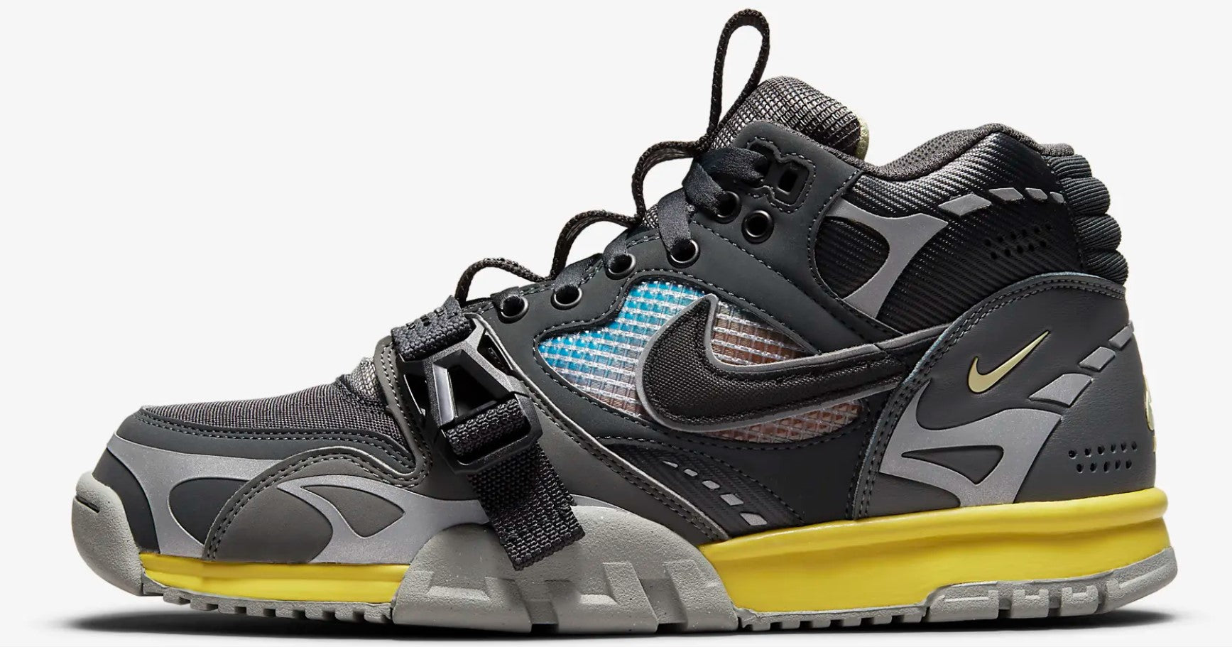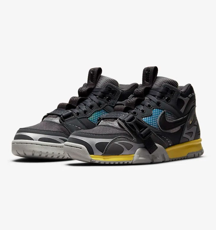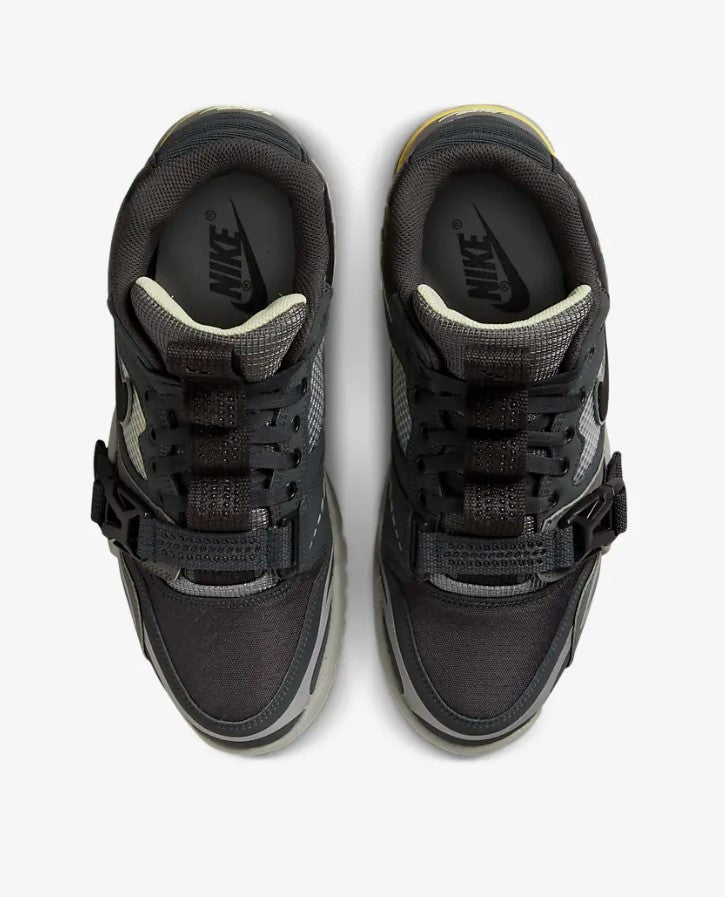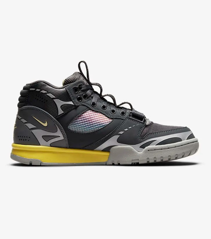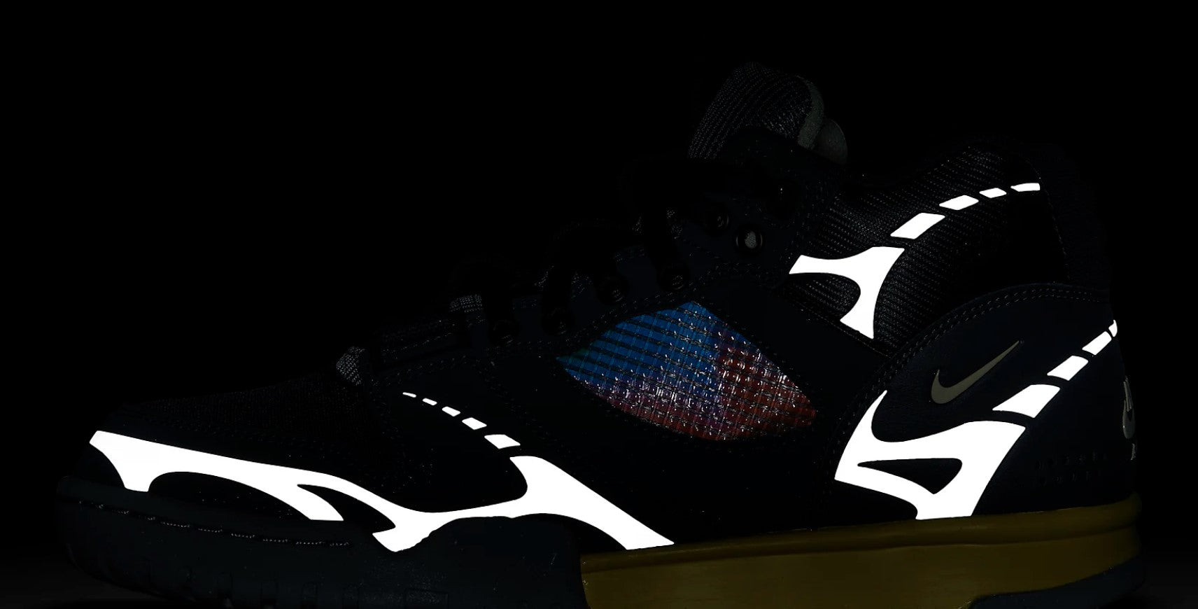 The Air Trainer 1 SP features a fabric upper with synthetic overlays, along with perforations in the toebox and heel. Reflective 3M accents highlight the shoe and surround the quarter panel Swoosh that partially covers an iridescent plastic window.