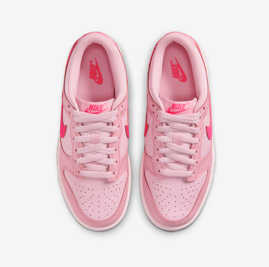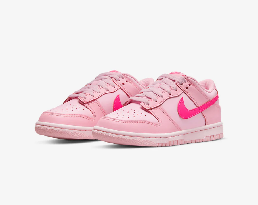 This Nike Dunk Low “Triple Pink” iteration boasts a full leather construction dipped in various hues of pink. Lighter tones cover the base and overlays, while a hi-vis “Hyper Pink” is used on the Swoosh insignias and Nike branding. Pink follows onto the midsole and outsole.