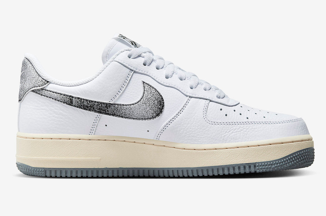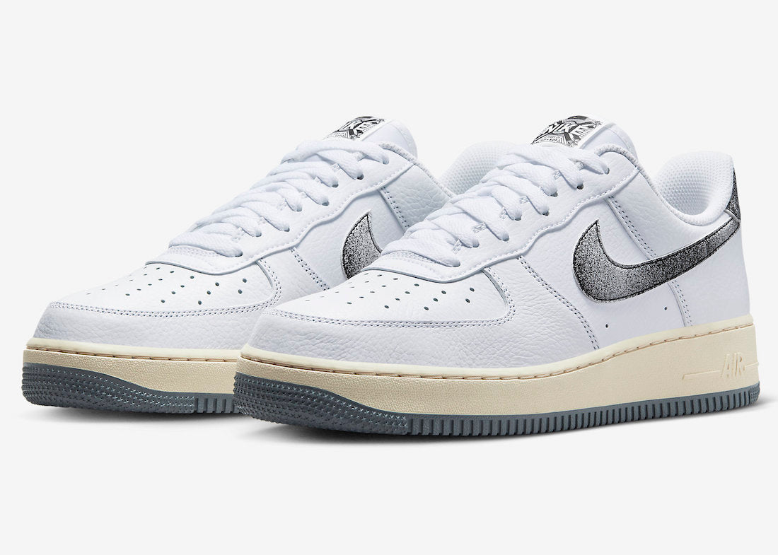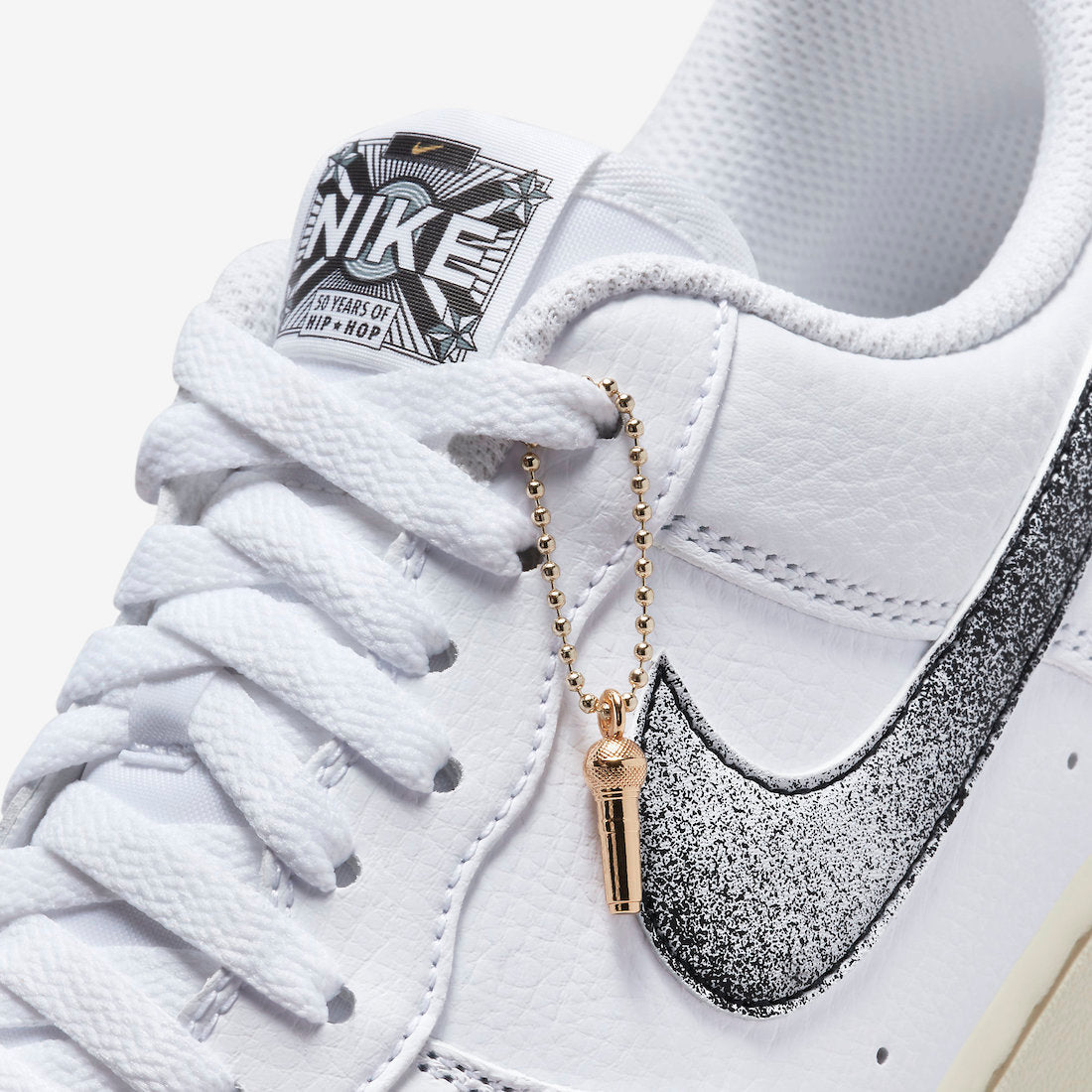Dressed in a White, Smoke Grey, Beach, and White color scheme. This offering the Nike Air Force 1 Low comes constructed in a leather build with mesh tongues and lining and worn-like Swooshes and heels. Parental Advisory-inspired “Nike Classics” insoles with cassette tape inspired tongue labels and a special Gold microphone hangtag completes the design.