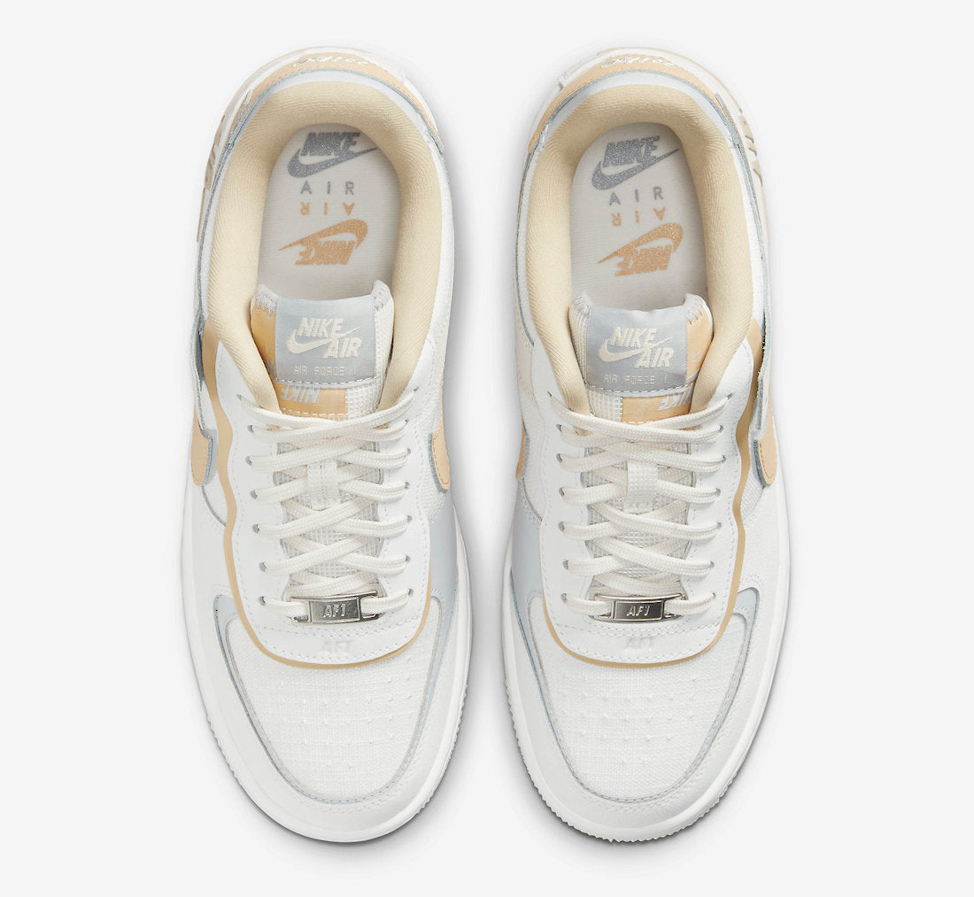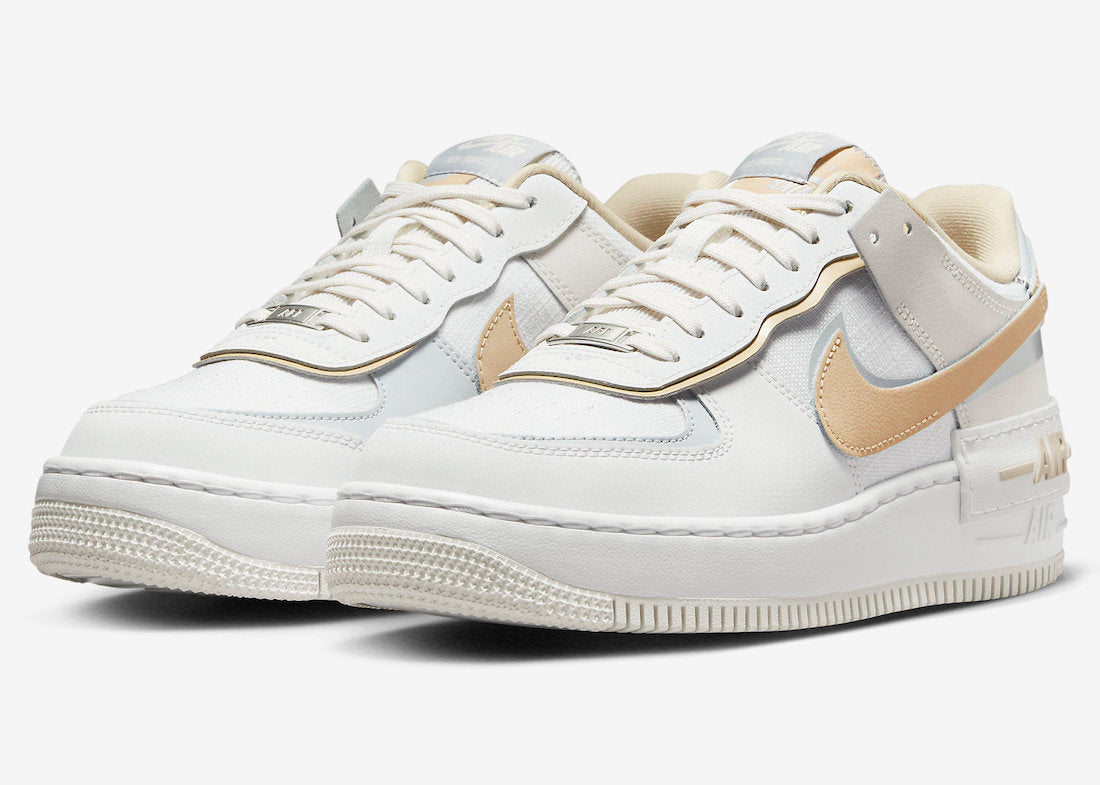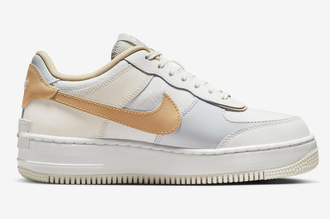 This offering of the Nike Air Force 1 Shadow arrives in a mix of Sail and Tan color tones. It comes constructed in a mix of leather and mesh materials featuring a layered aesthetic. Dual branding atop a two-tone rubber sole completes the design.
