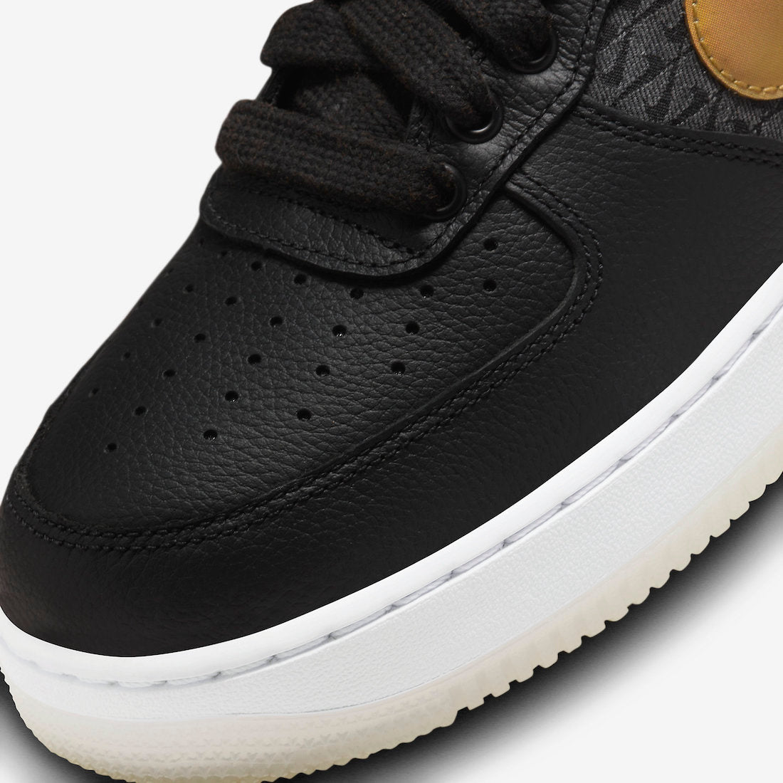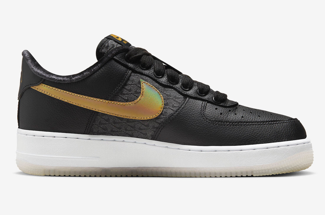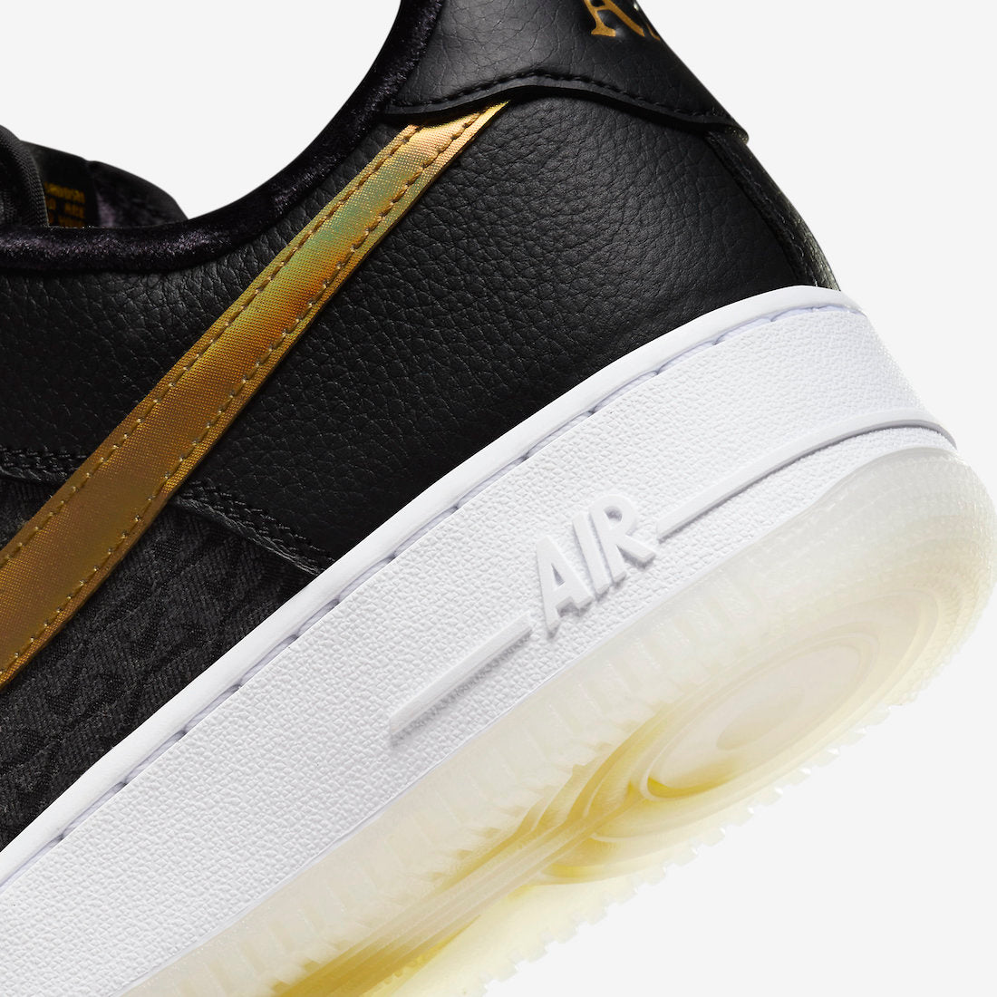 Dressed in a Black, Metallic Gold, and White color scheme. This offering of the Nike Air Force 1 Low features mesh tongues and side panels covered in repeated-swoosh branding with Black tumbled leather overlays and velour liners. Other details includes CD-inspired iridescent Swooshes, Metallic Gold tongue labels and “AF1” heels with special-celebrated vinyl lace dubraes and insole decals. A White midsole atop a translucent outsole with “Bronx Origins” underfoot completes the design.