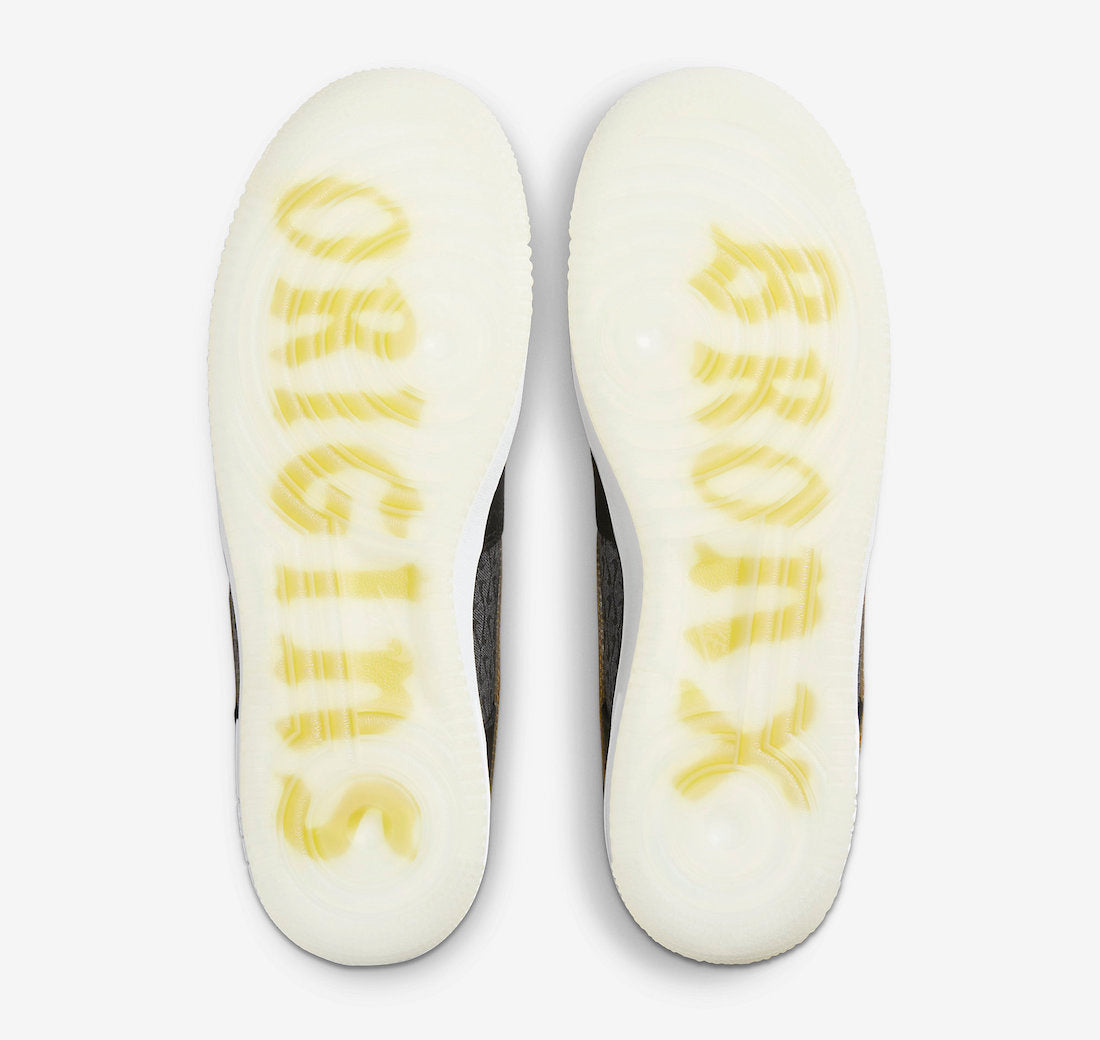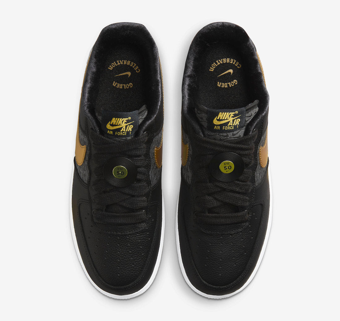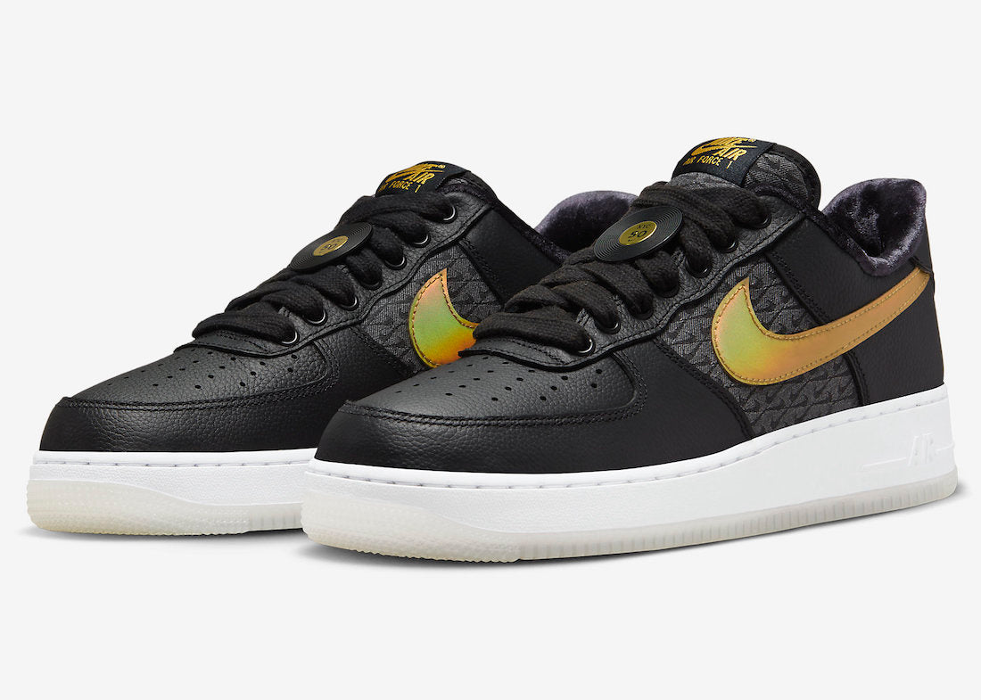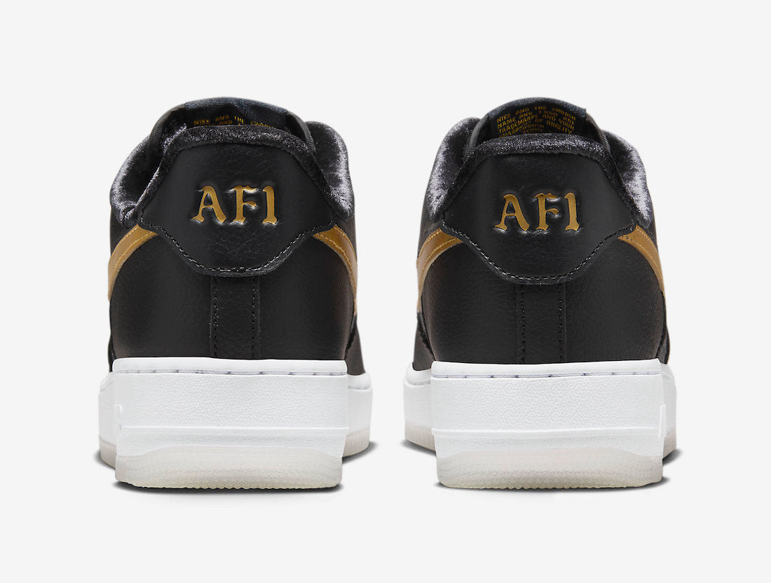 Dressed in a Black, Metallic Gold, and White color scheme. This offering of the Nike Air Force 1 Low features mesh tongues and side panels covered in repeated-swoosh branding with Black tumbled leather overlays and velour liners. Other details includes CD-inspired iridescent Swooshes, Metallic Gold tongue labels and “AF1” heels with special-celebrated vinyl lace dubraes and insole decals. A White midsole atop a translucent outsole with “Bronx Origins” underfoot completes the design.