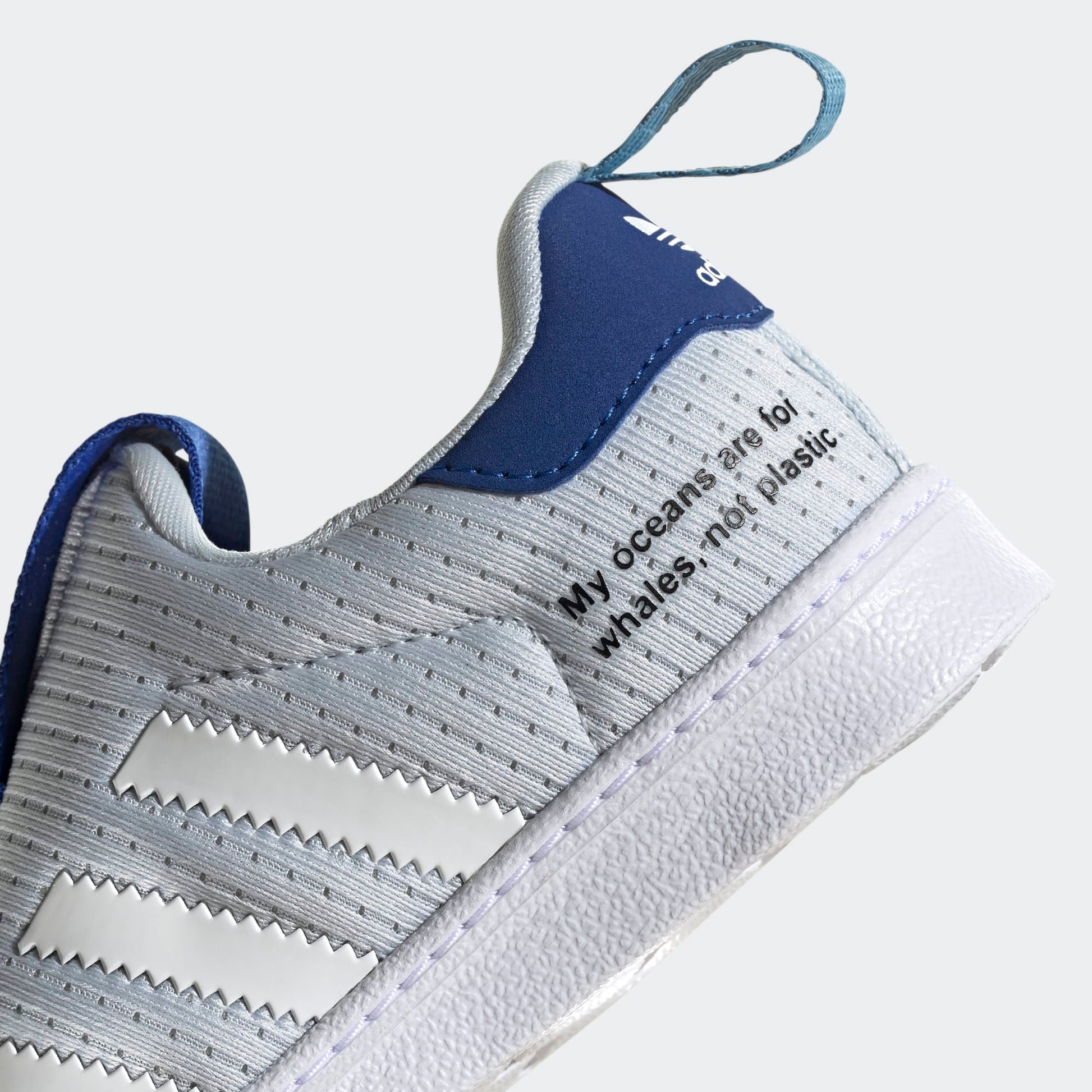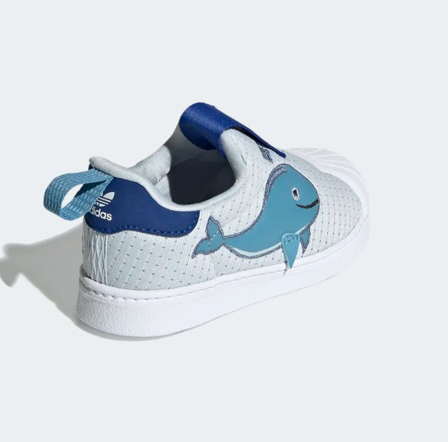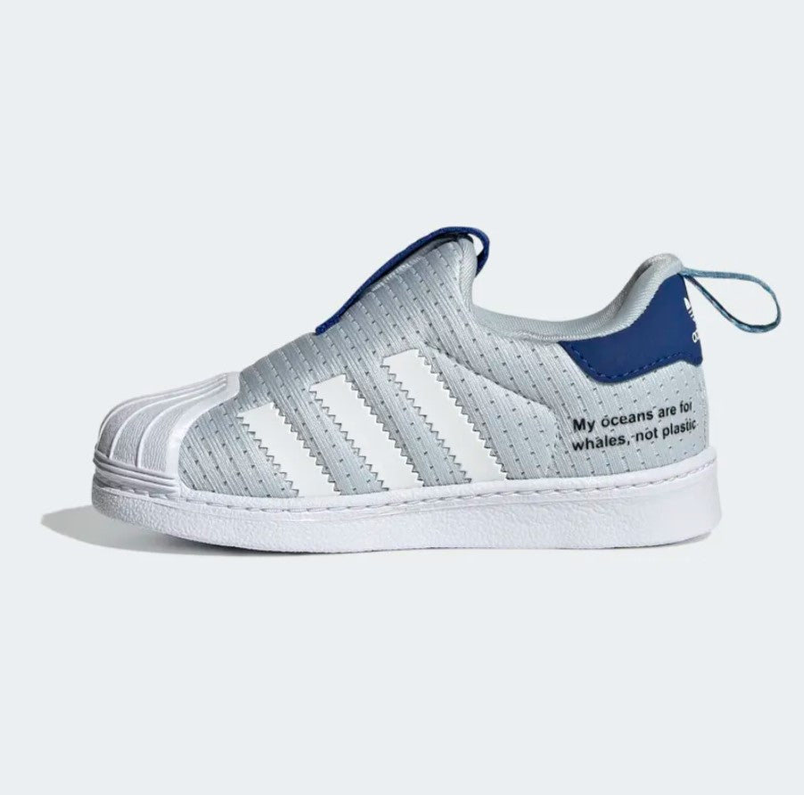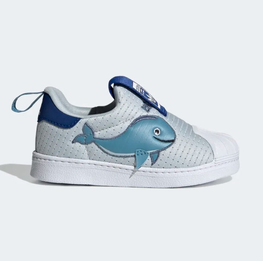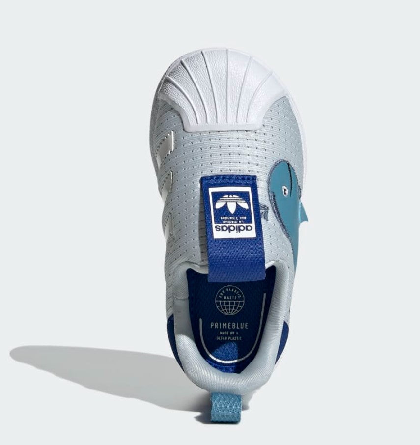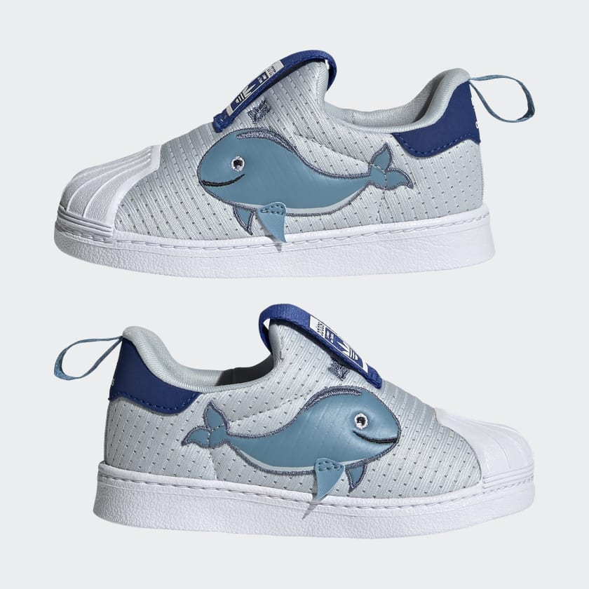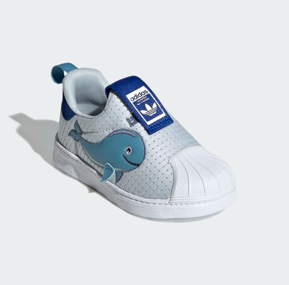 Consider the needs of little feet. Comfort? Yes. Style? Most definitely. These toddlers' adidas shoes check all the boxes. Their 360 design provides flexible cushioning during playtime. A classic shell toe flaunts heritage style. A whale on the side gets them dreaming about life in the ocean, so they can grow up knowing all the planet can provide. This product is made with Primeblue, a high-performance recycled material made in part with Parley Ocean Plastic. 50% of the upper is textile, 75% of the textile is Primeblue yarn. No virgin polyester.